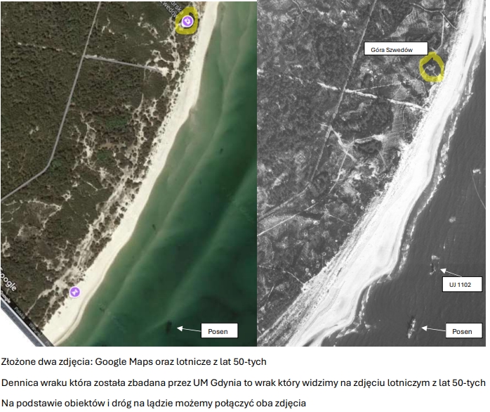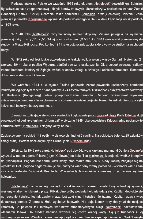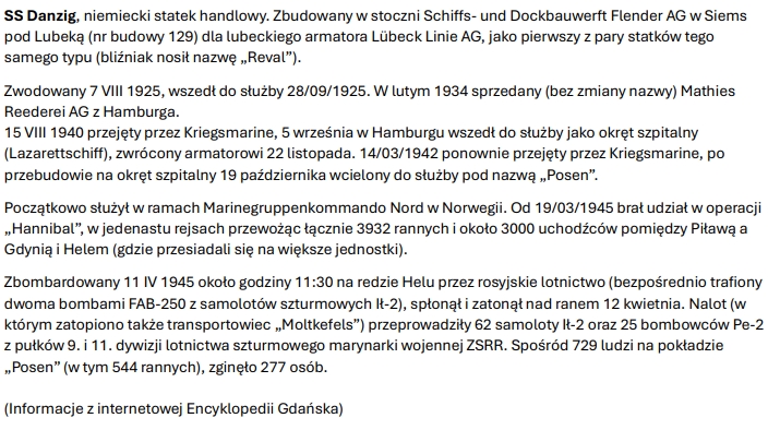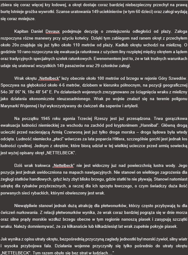 W końcowych miesiącach wojny, Półwysep Helski stanowił swego rodzaju stację pośrednią dla niemieckich uciekinierów w drodze na zachód. Statki z Piławy czy Gdyni dopływały na redę Helu i tam dobierały kolejnych uchodźców, (w pewnym momencie na półwyspie było 200 000 niemieckich uciekinierów) a potem płynęły w dalszą drogę do Świnoujścia czy Kilonii. Ponieważ port Helski nie był w stanie pomieścić tak wielkich statków operacja ta odbywała się na redzie. Wszystko to działo się po północnej stronie Helskiej Kosy, tak aby uniknąć radzieckich ataków. Metoda ta była wykorzystywana już po zajęciu Gdyni i Gdańska przez Rosjan, czyli koniec marca i kwiecień 1945 r. Dzięki temu statki były bezpieczne i chroniły się przed ostrzałem z brzegu. Oczywiście nie była to skuteczna osłona przed radzieckim lotnictwem, które w tym czasie praktycznie królowało nad Zatoką Gdańską. Rosjanie regularnie cały kwiecień bombardowali stojące na redzie jednostki część z nich skutecznie zatapiając. Wraki tych jednostek starczały długo jeszcze z wody. Po wojnie kilka z nich zostało wydobytych i wróciły do służby tak jak chociażby Albert Jensen, który podniesiony przez Rosjan pływał wiele lat pod nazwa Profesor Popow, czy Emliy Sauber podniesiona przez PRO i wcielona do polskiej floty jako "Kielce". Jednak wraki trzech jednostek; Moltkefels, Nettlebeck i Posen, zostały na dnie do dziś. Można je nawet wypatrzeć na Google maps, bo zalegają na głębokości od 3 do 5 m blisko brzegu. Resztki Nettelbeck, mylnie nazywane jako "dwa w jednym" są od lat celem nurkowych wypłynięć z Helu. Dlaczego 2 w 1 ? Ponieważ pierwsi nurkowie, którzy odkryli go ponad 30 lat temu myśleli że to stalowy wrak jednostki, który spoczął na drewnianym wraku żaglowca. W rzeczywistości jest to pojedynczy wrak metalowej jednostki z dużą ilością drewna z pokładu. Historia jego zatonięcia została szczegółowo opisana przez samego kapitana o nazwisku Daniel Devaux, który pojawił się w Gdańsku w 2005 roku prosząc o możliwość zorganizowania rejsu na wrak jego statku, przy okazji opowiadając przebieg katastrofy: otóż, Nettelbeck opuścił Piławe 25 stycznia 1945 na holu (podczas operacji Hannibal, Niemcy wykorzystywali wszystkie jednostki do ewakuacji uciekinierów z Prus Wschodnich, nawet te niesprawne) po minięciu helskiej kosy pogoda popsuła się na tyle, że statek zerwał się z liny i osiadł na mieliźnie. Załoga całą noc walczyła z żywiołem i w końcu, po założeniu tzw. tyrolki udało się uratować wszystkich 149 pasażerów w tym 60 dzieci, oraz całą 29 osobową załogę. Był to na prawdę spory wyczyn w tak trudnych warunkach. Historia Moltkefels i Posen jest trochę inna. Oba statki czekały na załadunek i oba zostały zatopione przez radzieckie lotnictwo. Na obu zginęło odpowiednio 500 i 277 osobo. Zresztą historie Moltkefels opisywaliśmy już rok temu (więcej tutaj) i odezwali się do nas potem mieszkańcy Półwyspu, którzy dobrze pamiętają jego historię. Statek Posen, służył na koniec wojny jako Szpitalniowiec i tak został zatopiony, jego wrak przez wiele lat był zasypany, co utrudniało lokalizacje i identyfikację. W zeszłym roku sztormy go odsłoniły i możemy podziwiać jego resztki na fantastycznych obrazach z multibeama wykonanych przez Urząd Morski w osobie Jacka Koszałki.